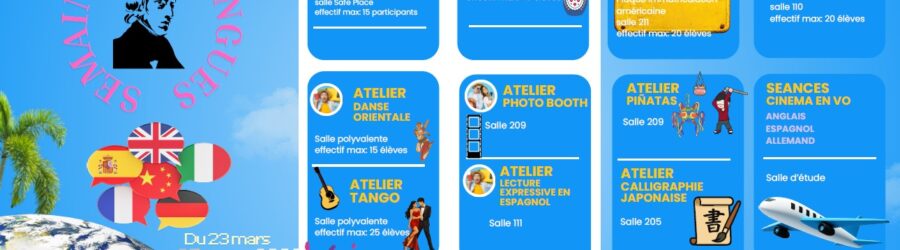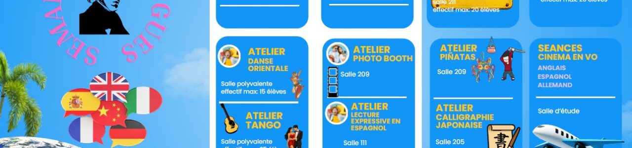 Votre attention à toutes et à tous, ici votre équipe éducative au micro. Le collège vous informe que la Semaine des Langues Vivantes et des Cultures est désormais en approche immédiate. Nous invitons l’ensemble des passagers à se préparer pour un embarquement direction découverte, partage et dépaysement total. Merci de sélectionner deux ateliers afin de confirmer votre préférence pour un vol unique dans la semaine. Les places étant limitées, nous vous recommandons de procéder à votre enregistrement sans tarder sur Pronote (à partir de 15h cet après-midi).